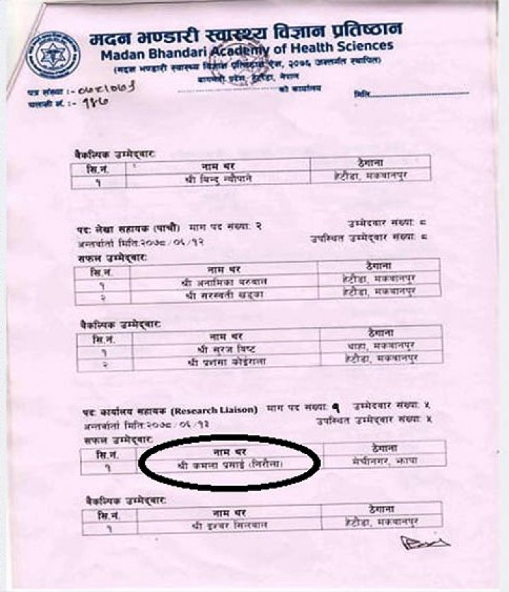मकवानपुर । मदन भण्डारी स्वास्थ्य विज्ञान प्रतिष्ठानका रजिष्टार राजेश प्रसाईले आफ्नो पदको दुरुपयोग गर्दै प्रतिष्ठानको कर्मचारीमा आफ्नै श्रीमतिलाई नियुक्त गरेका छन् ।