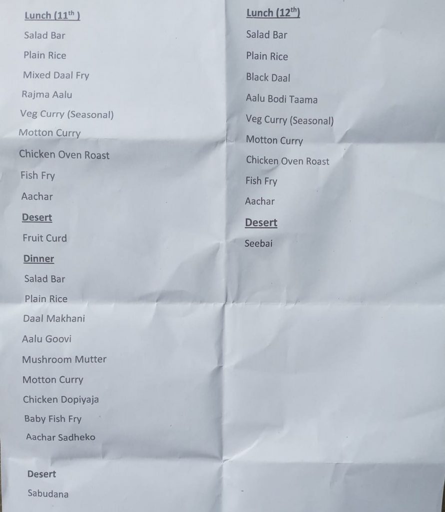 सेभेन स्टार होटल सौराहाका सञ्चालक माधव दवाडीका अनुसार तीन छाकमा १०/१० प्रकारका खानाको व्यवस्था हुनेछ । हरेक छाकमा खसीको मासु, कुखुराको मासु र माछा हुनेछ । पहिलो छाकमा सलाद बार, सादा खाना, मिक्स दाल फ्राई, राज्मा आलु, भेज करी, मटन करी, चिकन ओभन रोष्ट, माछा फ्राई, अचार र फलफूल रहने छन् ।