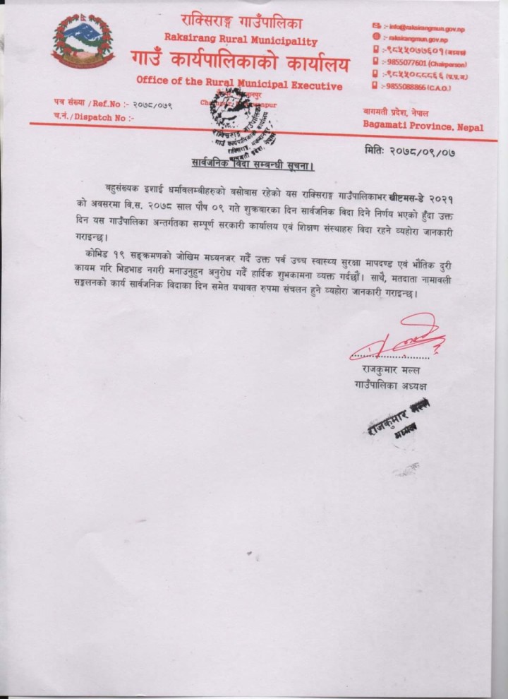 मकवानपुर । मकवानपुरको राक्सिराङ गाउँपालिकामा पुस ९ अर्थात भोली (शुक्रबार० सार्वजनिक विदा हुने भएको छ । गाउँपालिका अध्यक्ष राजकुमार मल्लले बिहीबार एक सुचना जारी गर्दै शुक्रबार ख्रिष्टमस पर्वको अवसरमा गाउँपालिकाभर सार्वजनिक विदा दिने निर्णय गरेको जानकारी दिएका हुन् ।