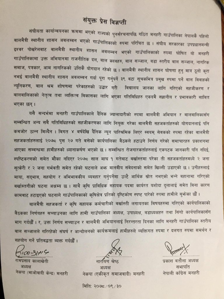 बालमैत्री सहजकर्ता हटाइएकोमा मनहरीका तीन दलको आपत्ति