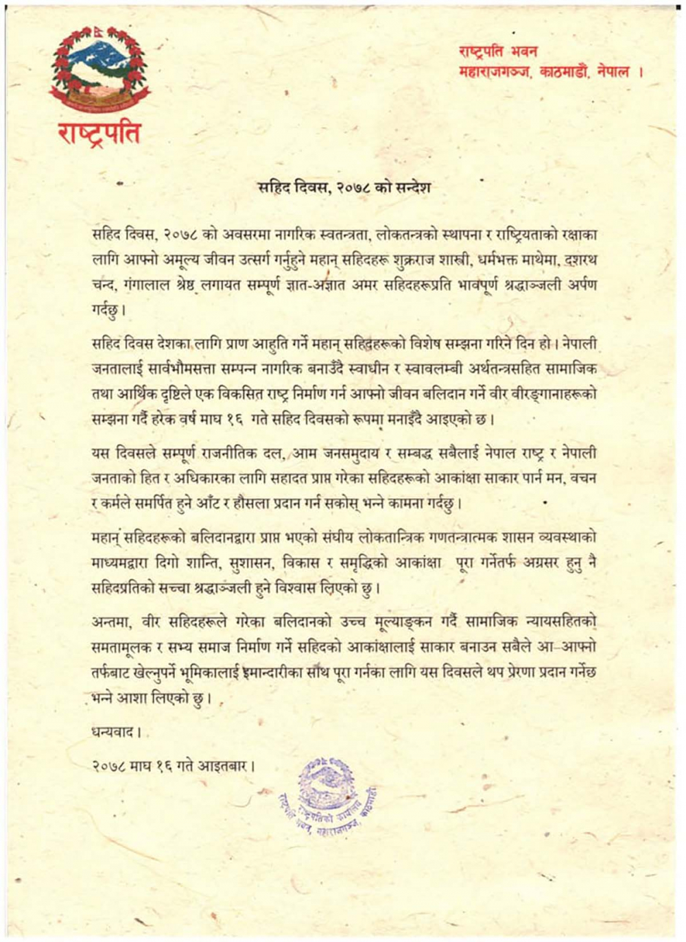 ‘सहिद दिवस देशका लागि प्राण आहुति गर्ने महान् सहिदहरूको विशेष सम्झना गरिने दिन हो । नेपाली जनतालाई सार्वभौमसत्ता सम्पन्न नागरिक बनाउँदै स्वाधीन र स्वावलम्बी अर्थतन्त्रसहित सामाजिक तथा आर्थिक दृष्टिले एक विकसित राष्ट्र निर्माण गर्न आफ्नो जीवन बलिदान गर्ने वीर वीरङ्गानाहरूको सम्झना गर्दै हरेक वर्ष माघ १६ गते सहिद दिवसको रूपमा मनाइँदै आइएको छ,’ राष्ट्रपति भण्डारीले जारी गरेको पत्रमा उल्लेख छ ।