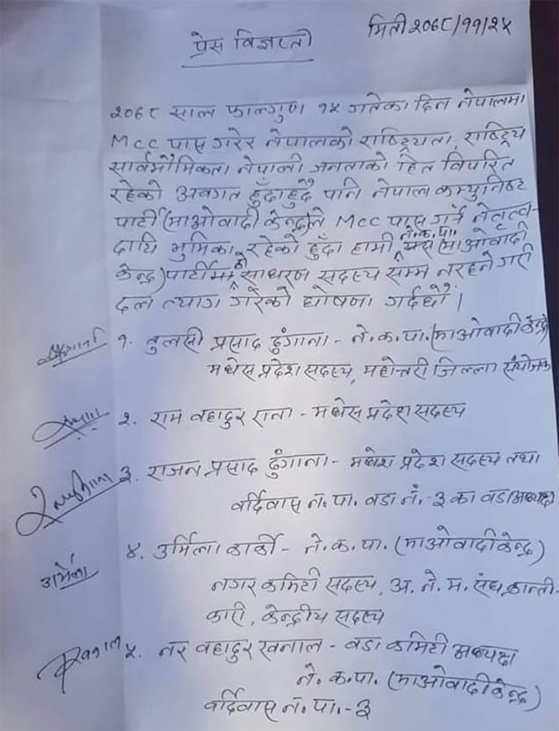 जनकपुरधाम । अमेरिकी सहयोग परियोजना एमसीसी पारित गराउन नेतृत्वदायी भूमिका निर्वाह गरेको भन्दै महोत्तरीमा नेकपा माओवादी केन्द्रका पाँच जना नेताले पार्टी छाडेको घोषणा गरेका छन् ।
