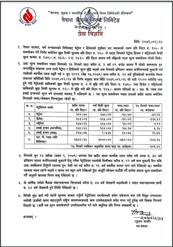 यसअघि जेठ १९ गते मात्र आयल निगमले यी तीनै पदार्थमा दस रूपैयाँ प्रतिलिटर भाउ घटाएको थियो । पछिल्लो समय अन्तर्राष्ट्रिय बजारमा तेलको भाउ बढेको र निगमको घाटा बढ्दै गएकाले मूल्य वृद्धि गर्नु परेको निगमले जनाएको छ ।