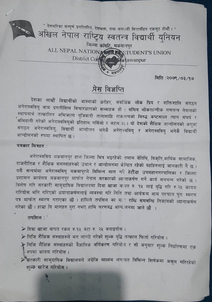 आज हेटौँडामा पत्रकार सम्मेलनको आयोजना गरि अनेरास्ववियुले १२ बुँदे माग राख्दै माग पुरा नभए आन्दोलनको चेतावनी दिएको हो । निजि शैक्षिक संस्थाहरुले अभिभावकको ढाड सेक्ने गरि गरिएको शुल्क वृद्धि तत्काल फिर्ता गरि शैक्षिक संस्थाको वैज्ञानिक वर्गिकरण गरि सोहि अनुरुप शुल्क निर्धारणमा एक रुपता ल्याउनसमेत माग गरेको छ ।
