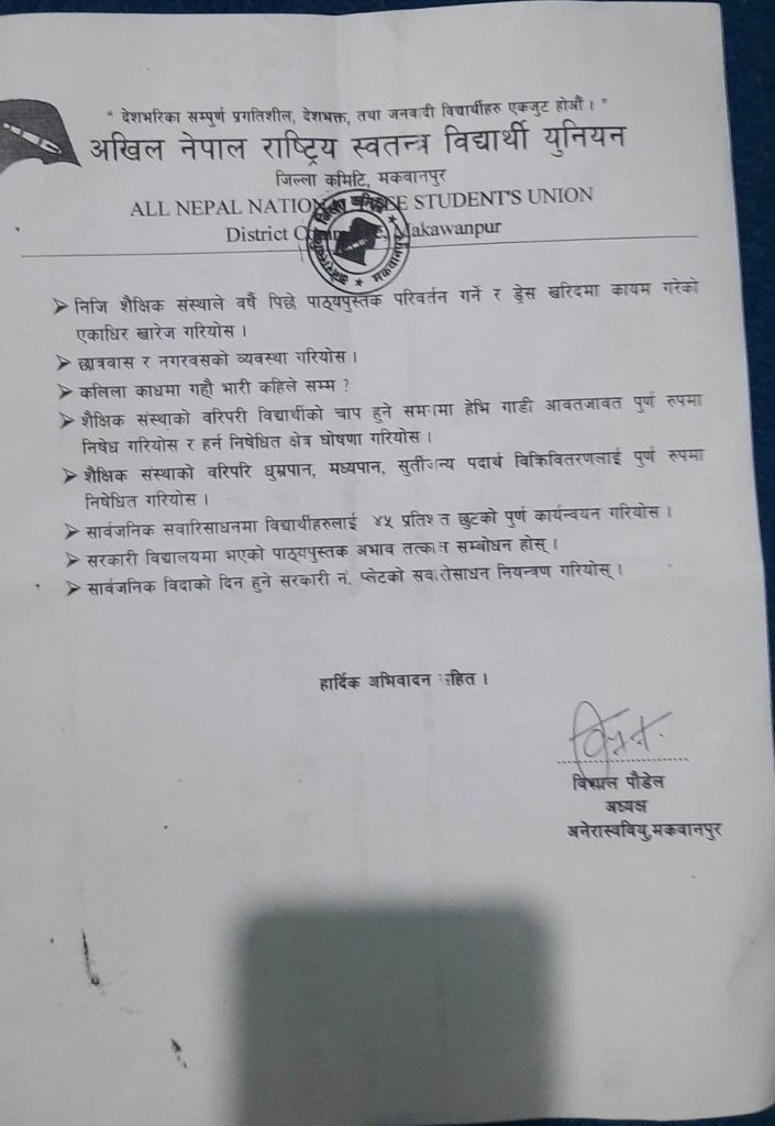 मकवानपुर । एमाले निकट विद्यार्थी संगठन अनेरास्ववियु मकवानपुले निजि विद्यालयले गरेको शुल्क वृद्धि तत्काल फिर्ता गर्न माग गरेको छ ।