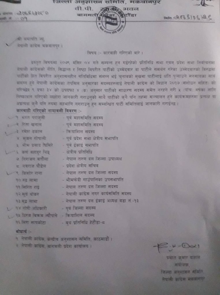 काँग्रेस मकवानपुरले गर्यो पूर्व महासमिति सदस्यसहित १६ जनालाई साधारण सदस्य समेत नरहने गरि कारवाही
