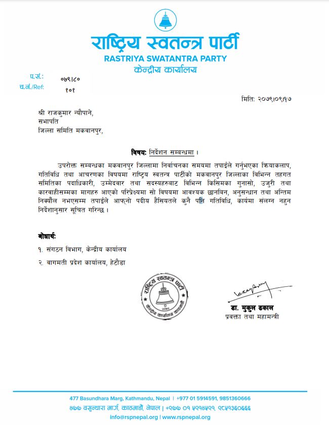 मकवानपुर । राष्ट्रिय स्वतन्त्र पार्टी मकवानपुरका सभापति राजकुमार न्यौपानेलाई पार्टीको कुनै पनि कार्यमा संलग्न नहुन पार्टी केन्द्रीय समितिले निर्देशन दिएको छ ।