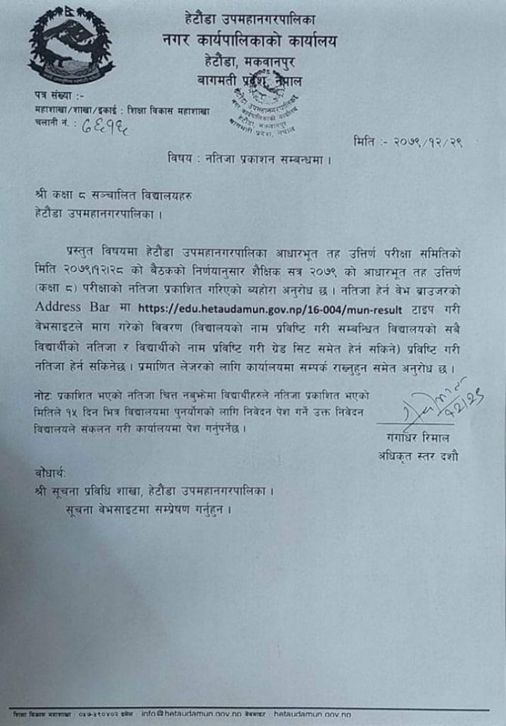हेटौंडा उपमहानगरपालिका शिक्षा विकास महाशाख प्रमुख गंगाधर रिमालले नतिजा आज बुधबार प्रकाशित गरेको र नतिजा उपमहानगरको बेभसाइट मार्फत हेर्न मिल्ने बताएका छन्। हेटौंडा उपमहानगरपालिका आधारभूत तह उत्तिर्ण परीक्षा समितिको मंगलबार बसेको बैठकले नतिजा प्रकाशन गर्ने निर्णय गरेको हो ।