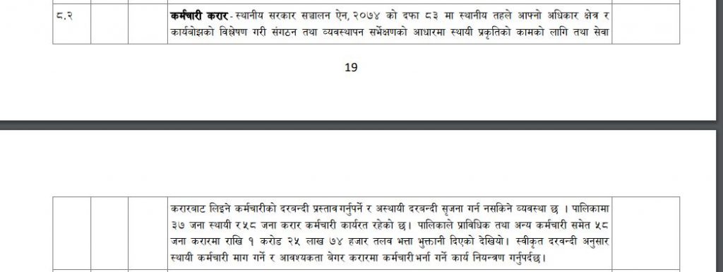 ३७ जना स्थायी कर्मचारी कार्यरत पालिकामा प्राविधिक तथा अन्य कर्मचारी समेत गरि ५८ जना करारमा भर्ना गर्दा राज्यलाई थप वार्षिक १ करोड २५ लाख ७४ हजार भार थपिएको महालेखा परीक्षकको प्रतिवेदनमा उल्लेख छ ।