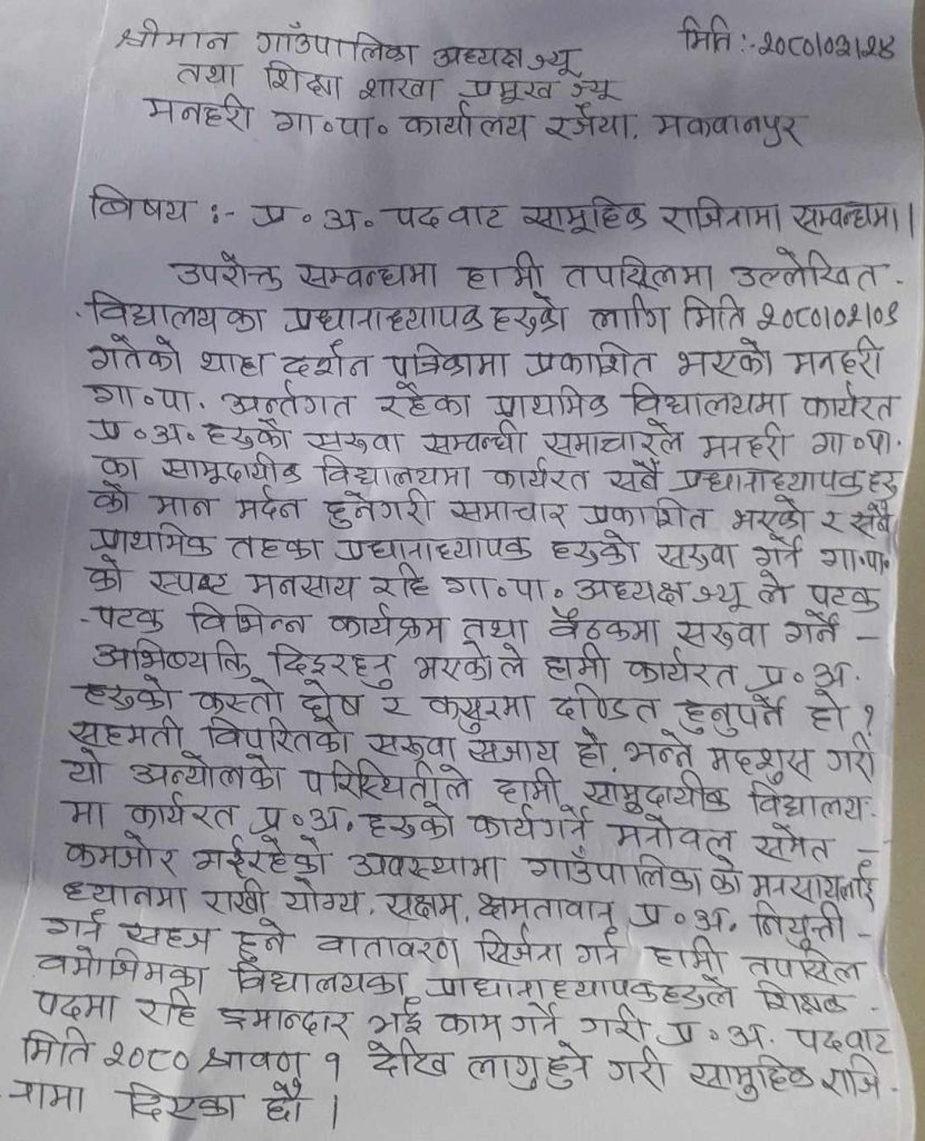 मकवानपुर । मकवानपुरको मनहरी गाउँपालिकास्थित विभिन्न १९ विद्यालयका प्रध्यानाध्यापकहरुले सामूहिक राजीनामा दिएका छन् ।