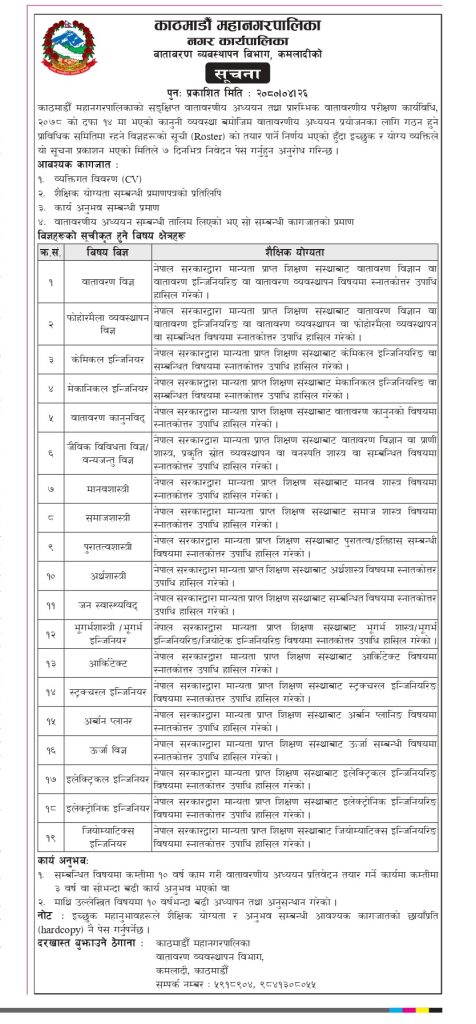 मान्यता प्राप्त शिक्षण संस्थाबाट सम्बन्धित विषयमा स्नातकोत्तर उपाधि हासिल गरेको तथा सम्बन्धित विषयमा कम्तीमा १० वर्ष काम गरी वातावरणीय अध्ययन प्रतिवेदन तयार गर्ने कार्यमा कम्तीमा ३ वर्ष वा सोभन्दा बढी कार्य अनुभव भएको वा माथि उल्लिखित विषयमा १० वर्षभन्दा बढी अध्यापन तथा अनुसन्धान गरेको हुनेपर्ने जनाइएको छ । इच्छुक व्यक्तिलाई ७ दिनभित्र आवदेन दिन पनि महानगरपालिकाले आग्रह गरेको छ ।