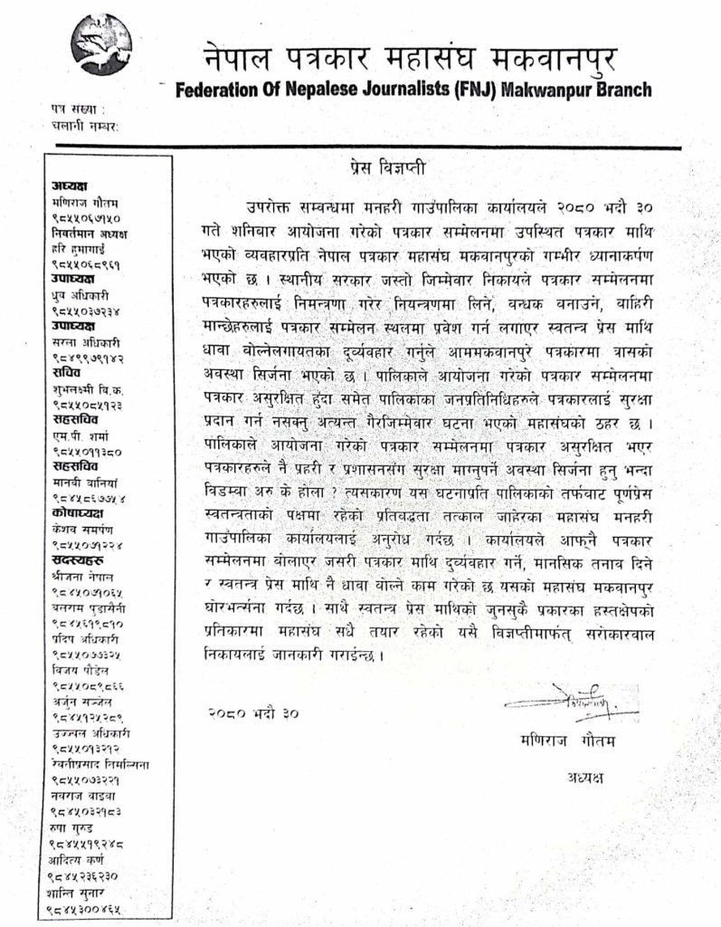 मनहरी गाउँपालिकाको कार्यालयले पत्रकार सम्मेलनमा पत्रकारहरुलाई निमन्त्रणा गरेर नियन्त्रणमा लिने, बन्धन बनाउने, बाहिरी मान्छेहरुलाई पत्रकार सम्मेलन स्थलमा प्रवेश गर्न लगाएर स्वतन्त्र प्रेस माथि धावा बोल्ने लगायतका दुव्र्यवहार गर्नाले मकवानपुरे पत्रकारमा त्रासको अवस्था सिर्जना भएको महासंघ मकवानपुरले जनाएको छ । विज्ञप्ती जारी गर्दै महासंघले पालिकाले आयोजना गरेको पत्रकार सम्मेलनमा पत्रकार नै असुरक्षित हुँदा समेत जनप्रतिनिधिहरुले पत्रकारलाई सुरक्षा प्रदान गर्न नसक्नु अत्यन्त गैरजिम्मेवार घटना भएको दाबी गरेको छ ।