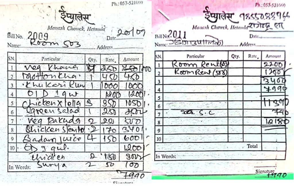 गाउँपालिकाको कार्यालयबाट १३ हजार २ सय २१ रुपैयाँ बराबरको बिल भुक्तानी भएको हो । होटललाई गाउँपालिकाको नाममा ३ थान रुम, ७ थान खाना र ७ थान ब्रेकफास्टको बिल बनाउन लगाएर प्रमुख प्रशासकीय अधिकृत कार्कीले सो रकम भुक्तानी गराएका हुन् ।
