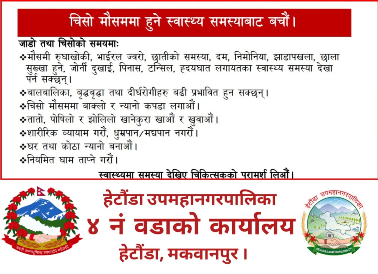 ‘यसको लागि हेटौंडा १२, १३ र १४ का संगठन तथा पार्टी नेतृत्वले व्यवस्थापन गर्नेछ’ नगरकोटीले भने । उद्घाटन कार्यक्रममा सांस्कृतिक प्रस्तुति समेत रहने बताइएको छ ।
