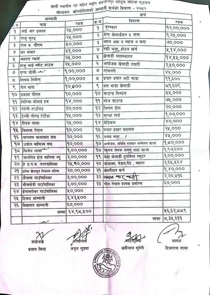 महिला गोल्डकपमा ८ लाख ३५ हजार मुनाफा, तलब भत्तामै सकियो ७ लाख ५६ हजार