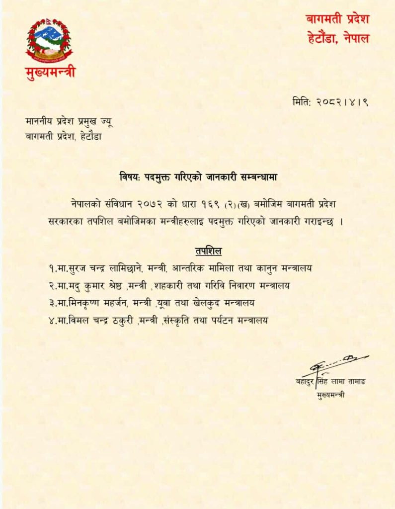 हेटौँडा । बागमती प्रदेशका चार मन्त्रीले दिएको राजीनामा स्वीकृत नगरी मुख्यमन्त्री बहादुरसिंह लामा (तामाङ) ले उनीहरुलाई पदमुक्त गरेका छन् ।