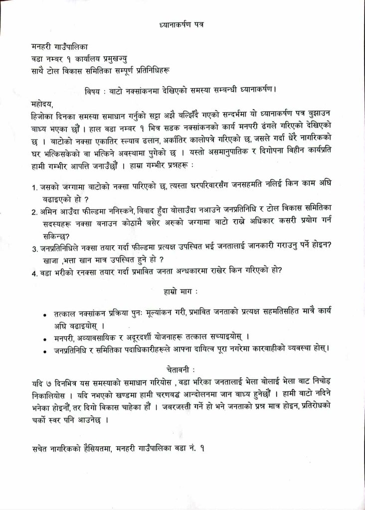 आइतबार उक्त बिषयमा मनहरी गाउँपालिका–१ सचीव र सम्पूर्ण टोल विकाससमितिका प्रतिनिधिहरुलाई वडाका नागरिकहरुले ध्यानाकर्षण पत्र बुझाएका हुन् ।