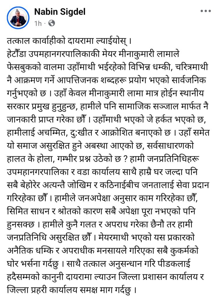 हेटौंडा । हेटौंडा उपमहानगरपालिकाकी मेयर मीनाकुमारी लामामाथि भइरहेको निरन्तरको धम्की र चरित्र हत्याको प्रयासको घटना सार्वजनिक भएपछि हेटौंडा वडा नम्बर ४ का अध्यक्ष नवीन सिग्देलले कडा शब्दमा आपत्ति जनाउँदै तत्काल कारबाहीको माग गर्नुभएको छ ।