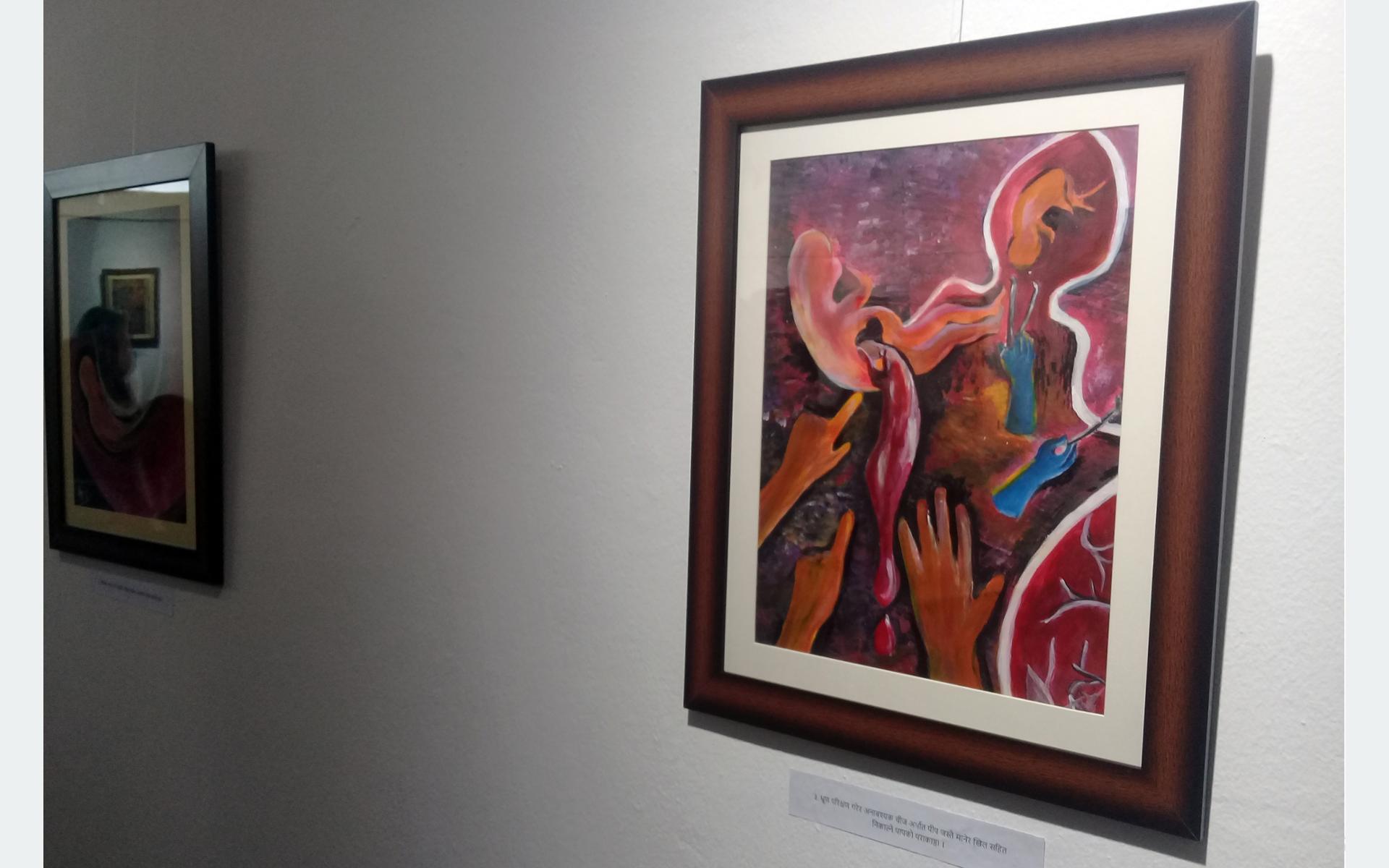 काठमाडौँ । काठमाडौँको बबरमहलस्थित नेपालकला परिषद्मा बाल चित्रकार काठमाडौँकी सुप्रिया पाण्डेको पहिलो एकल चित्रकला प्रदर्शनीको चित्र नं ३ झट्ट आँखा पुग्ने जो कोहीलाई एकछिन् टक्क अड्याउने खालको छ । चित्रको मुनी लेखिएको छ, “अनुचित भ्रूण परीक्षण पश्चात अनावश्यक चीज (पीप जस्तै मानेर) खिलसहित निकाल्ने पापको पराकाष्ठा ।” क्यान्भासमा गर्भभित्रै...