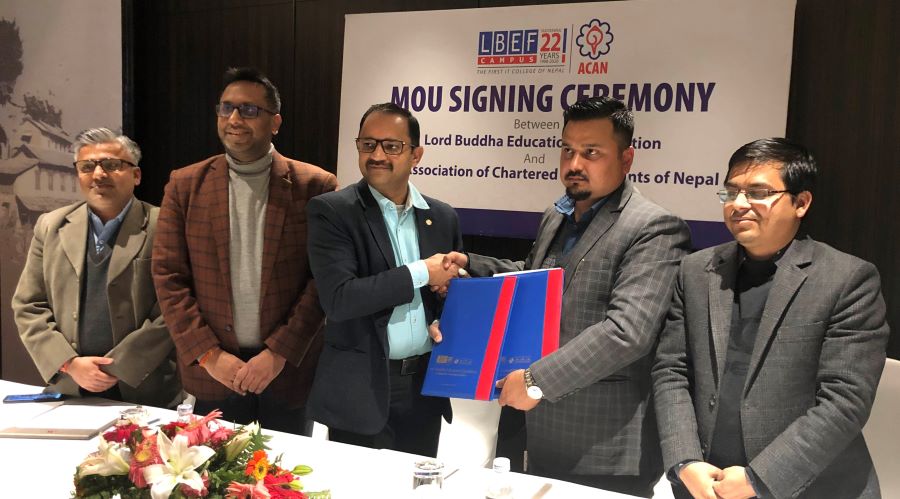 काठमाडौं । लर्डबुद्ध एजुकेसन फाउन्डेसन (एलबिइएफ) र द एसोसिएसन अफ चार्टर्ड एकाउन्टेन्ट्स अफ नेपाल (एक्यान)बीच एक समारोहमा शैक्षिक सहकार्यका लागि समझदारी भएको छ । शुक्रबार एलबिइएफका अध्यक्ष पंकज जालान र एक्यानका अध्यक्ष आनन्द शर्माले समझदारीपत्रमा हस्ताक्षर गरेका हुन् । समझदारी अनुसार लर्डबुद्ध एजुकेसन फाउन्डेसन अन्तर्गतको कलेज फर प्रोफेसनल स्टडिजमा...