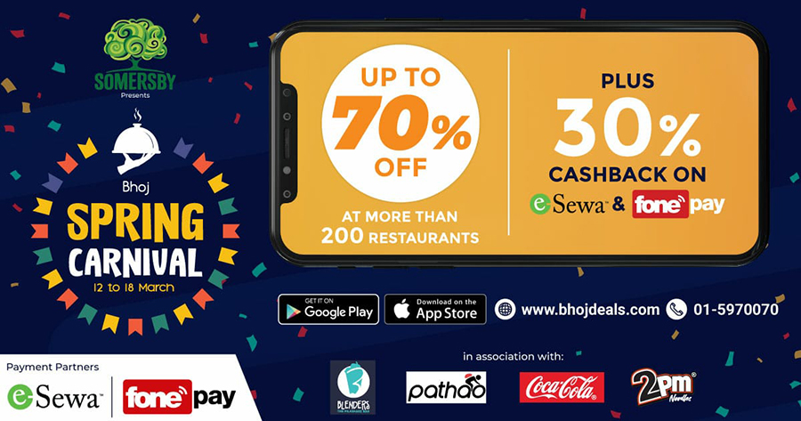 काठमाडौँ । अनलाइन अर्डर मार्फत घरघरमा खानेकुरा पुर्याउने ‘भोज’ ले सुरु गरेको अनलाइन खाना मेला आजबाट सुरु भएको छ। मेलाको दौरानमा उपत्यका भित्रका २०० भन्दा बढी रेष्टुराँहरुबाट खाना अर्डर गरे बापत ७० प्रतिशतसम्म छुट पाइने र ई सेवा र फोन पेका माध्यमबाट बिल तिर्दा ३० प्रतिशत क्यास ब्याक पाइने...
