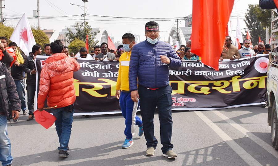 काठमाडौं । नेपाल कम्युनिस्ट पार्टी, नेकपा (माधव-प्रचण्ड )समुहको विराेध जुलुस विभिन्न स्थानबाट सुरु भएको छ । माइतीघर, पुल्चोक, त्रिपुरेश्वर, केशर महल र जमलबाट जुलुस निस्किएका छन् । ती जुलुसहरु सुन्धारामा पुगेर मूल जुलुसमा मिसिने छन् । अध्यक्ष प्रचण्ड,माधव नेपाल लगायतले नेतृत्व गरेको मूल जुलुस विभिन्न स्थान परिक्रमा गर्दै भृकुटीमण्डपमा...