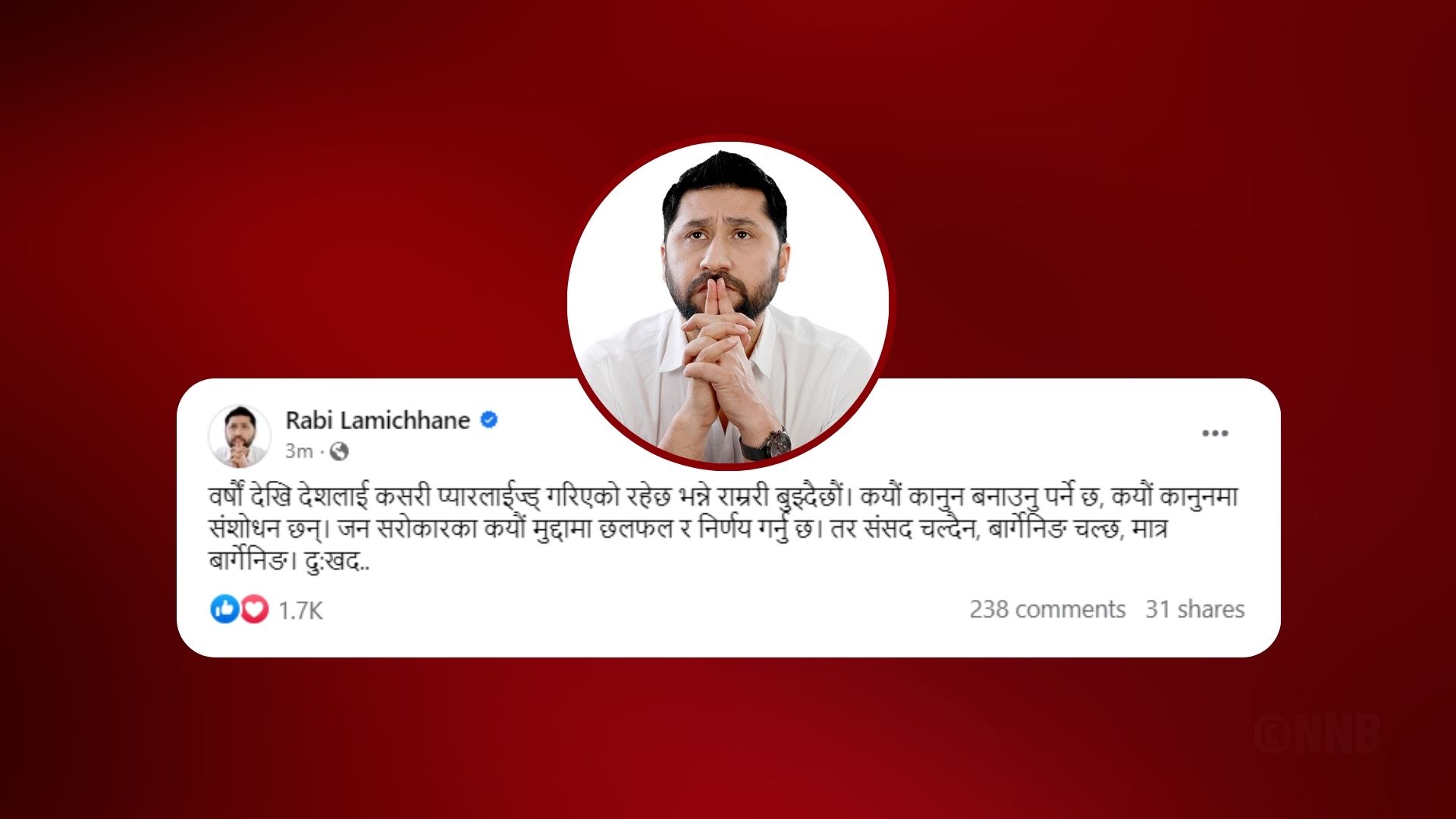 काठमाडौं । राष्ट्रिय स्वतन्त्र पार्टीका सभापति रवि लामिछानेले संसद नचल्ने तर मात्र बार्गेनिङ चल्ने टिप्पणी गरेका छन् । सोमबार सामाजिक संञ्जाल फेसबुकमा आफ्नो धारणा राख्दै उनले लेखेका छन् ‘ बर्षौदेखि देशलाई कसरी प्यारलाईज्ड गरिएको रहेछ भन्ने राम्ररी बुझ्दैछौं । कयौं कानून बनाउनु पर्ने छ, कयौं कानूनमा संशोधन गर्नुपर्ने छ,...