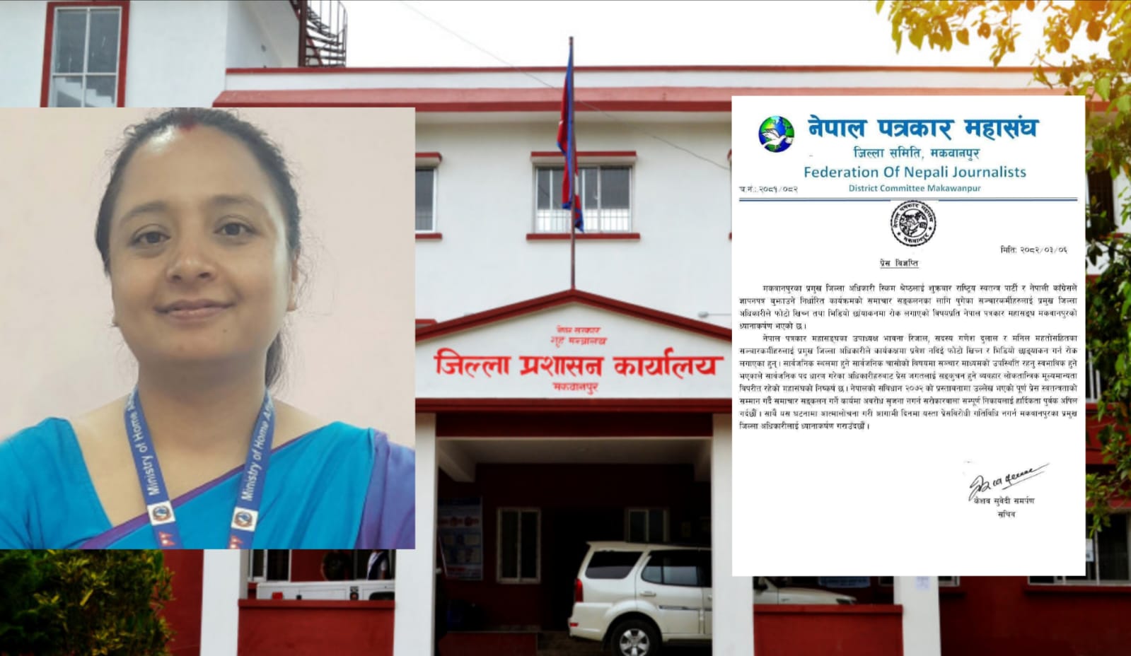 हेटौंडा।मकवानपुरका प्रमुख जिल्ला अधिकारी (प्रजिअ) स्किम श्रेष्ठले सञ्चारकर्मीहरुलाई फोटो तथा भिडियो खिच्न रोक लगाएपछि नेपाल पत्रकार महासंघ मकवानपुरले गम्भीर ध्यानाकर्षण जनाएको छ। शुक्रवार जनप्रतिनिधिमाथिको आक्रमणसम्बन्धी छलफल तथा तीन वटा छुट्टाछुट्टै ज्ञापनपत्र बुझाउने कार्यक्रमको समाचार संकलन गर्न पुगेका पत्रकारलाई प्रवेशमा रोक लगाउँदै कार्यकक्षभित्र दृश्य खिच्न निषेध गरिएको थियो । उक्त...