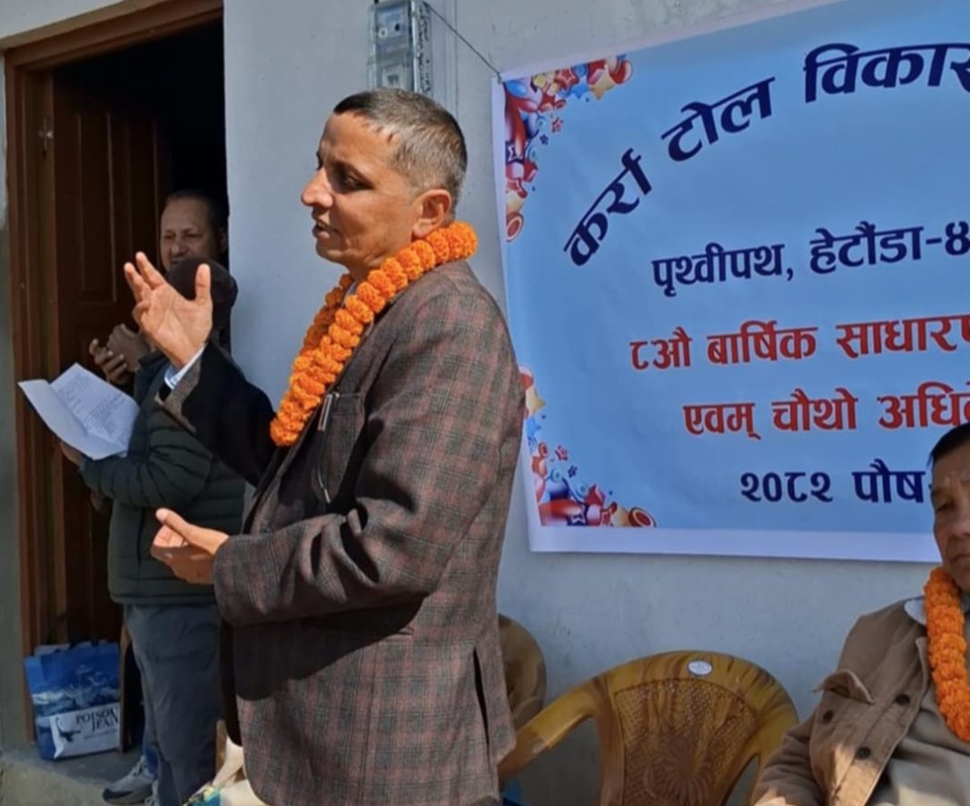 हेटौंडा । हेटौंडा–४ का वडा अध्यक्ष नविन सिग्देलले वडाभित्र रहेका सामुदायिक विद्यालयमा गुणस्तरीय शिक्षा सुनिश्चित गरिएको भन्दै आफ्ना बालबालिकालाई ढुक्क भएर सामुदायिक विद्यालयमै भर्ना गराउन अभिभावकहरूलाई आग्रह गरेका छन् । कर्रा टोल विकास संस्थाको ८ औँ साधारणसभाको उद्घाटन गर्दै वडा अध्यक्ष सिग्देलले शिक्षा विकासका लागि जनप्रतिनिधि, विद्यालय व्यवस्थापन समिति...