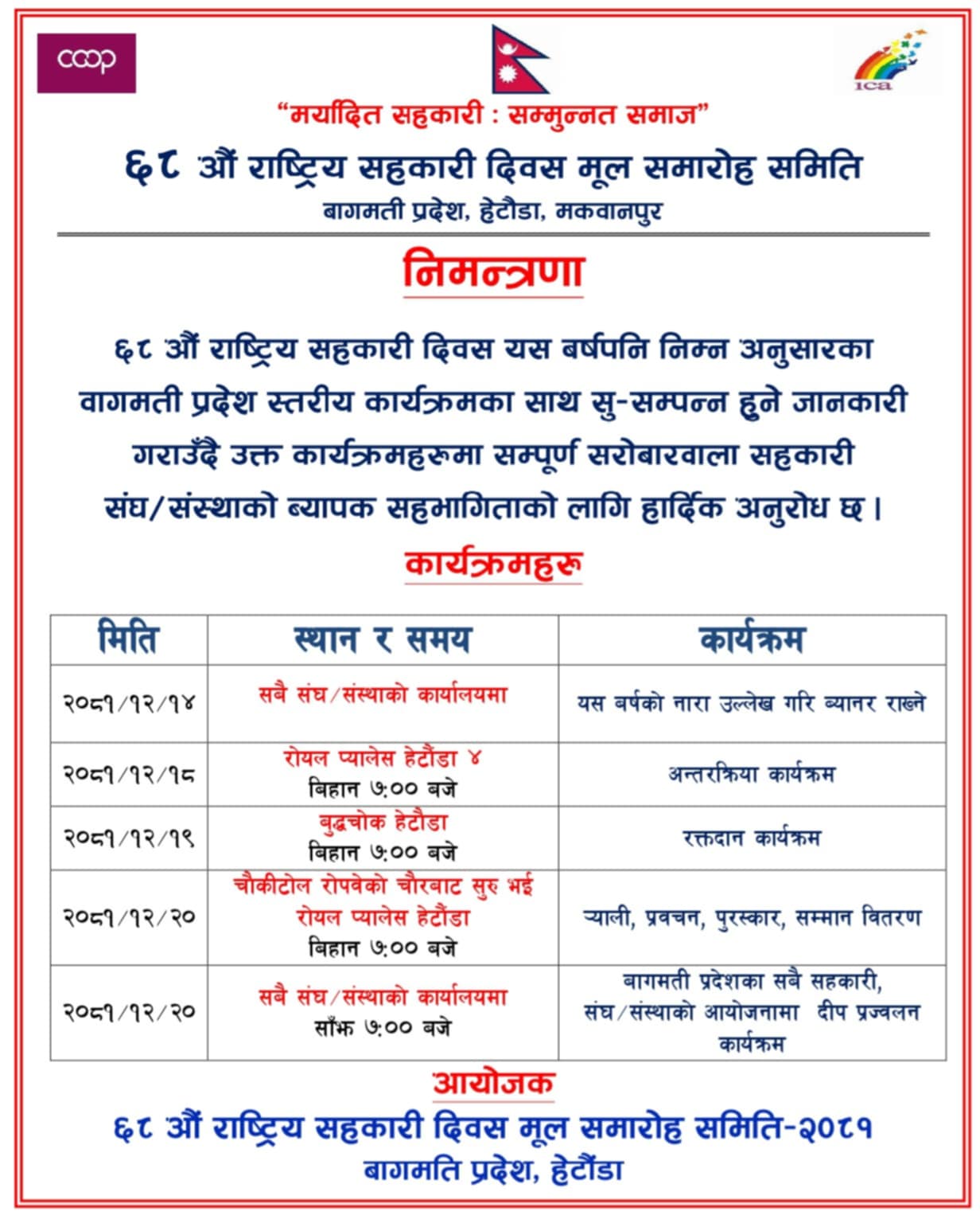 हेटौंडा । “मर्यादित सहकारीः समुन्नत समाज” भन्ने नाराका साथ ६८औं राष्ट्रिय सहकारी दिवस बागमती प्रदेशमा भव्य रूपमा मनाइने भएको छ। बागमती प्रदेश सहकारी तथा गरिबी निवारण मन्त्रालय, प्रदेश सहकारी विकास बोर्ड, मकवानपुर जिल्ला सहकारी संघ र विषयगत सहकारी संघसंस्थाहरूको समन्वयमा विभिन्न कार्यक्रमसहित दिवस मनाउने तयारी गरिएको छ। दिवसको मूल...