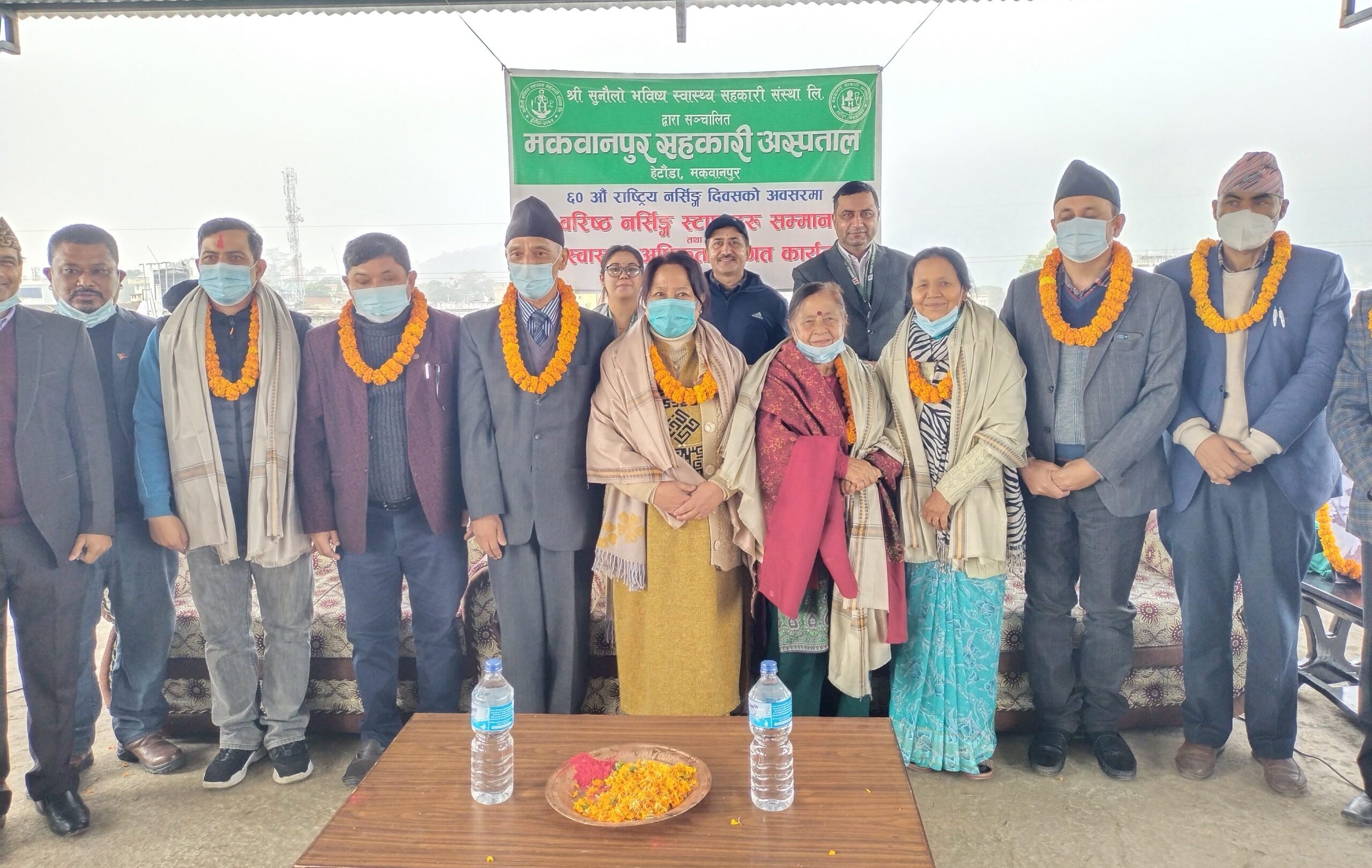 मकवानपुर । मकवानपुर सहकारी अस्पतालले मकवानपुरका अग्रज नर्सलाई सम्मान गरेको छ । ६० औं नर्सिङ दिवसको अवसरमा आज बिहान एक कार्यक्रमका बीच मकवानपुरका अग्रज नर्सहरु बुनु शर्मा, चम्पा कोजु र धन राईलाई दोसल्ला ओढाएर सम्मान गरेको हो । सहकारी अस्पतालका अध्यक्ष विष्णु गोपाल महर्जनको अध्यक्षता तथा मदन भण्डारी स्वास्थ्य...