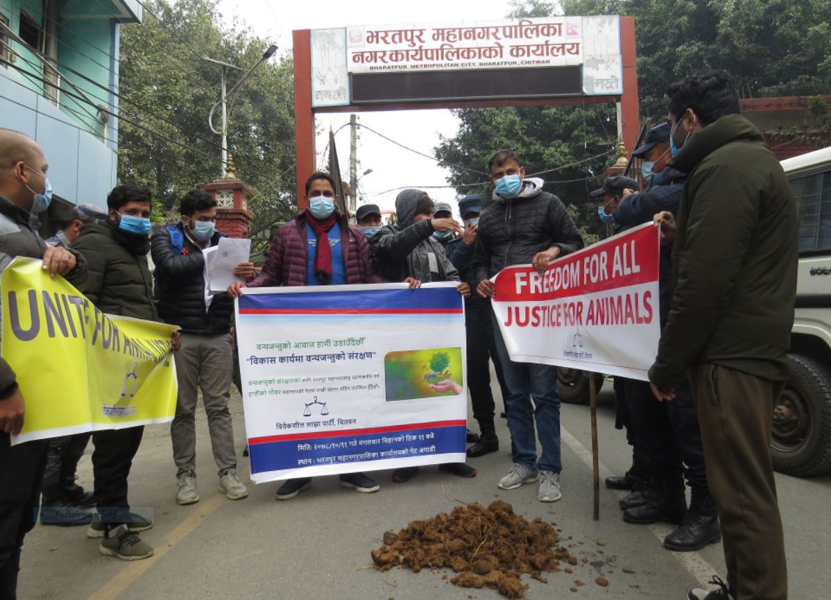 चितवन । सडक विस्तारका क्रममा नाली बनाउन खनिएको खाल्डोमा परेर एकसिंगे गैंडा मरेको विरोधमा मंगलबार विवेकशील साझा पार्टी चितवनले भरतपुर महानगरपालिकाको प्रवेशद्वारअघि हात्तीको गोबरसहित प्रदर्शन गरेको छ । प्रहरी निरीक्षकको नेतृत्वमा खटिएको टोलीसँग धकेलाधकेल गर्दै विवेकशील साझाका कार्यकर्ताले विरोध प्रदर्शन गरेका थिए । ‘वन्यजन्तुको संरक्षणका लागि महानगर संवेदनशील होस् भनेर ध्यानाकर्षण...