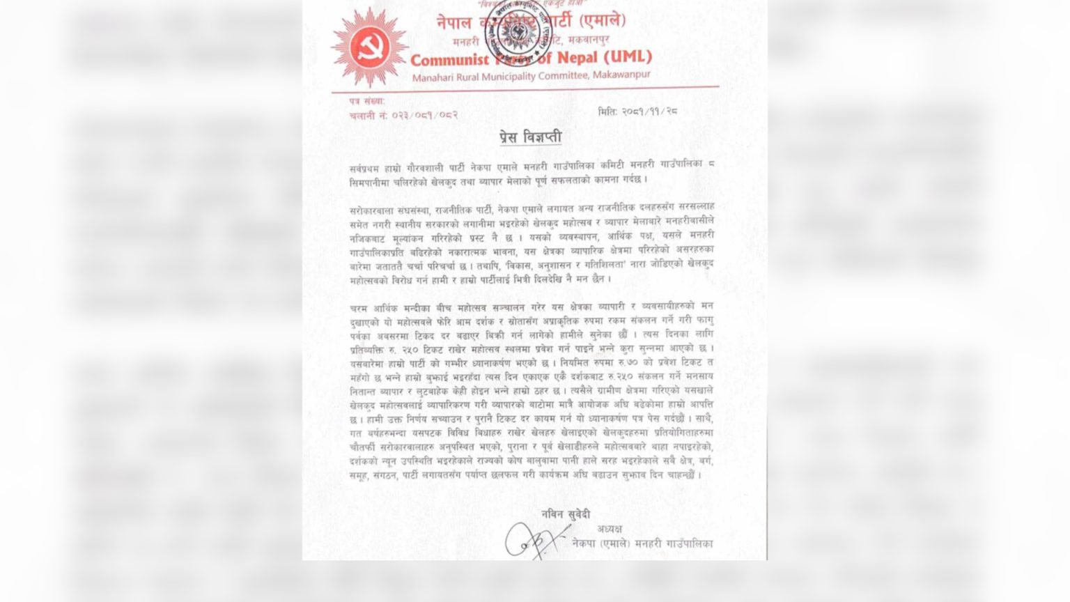 हेटौंडा । मकवानपुरको मनहरी-८ मा जारी मनहरी खेलकुद तथा व्यापार महोत्सवमा प्रवेश टिकट दर वृद्धि गरिएको भन्दै नेकपा एमाले मनहरी गाउँ कमिटीले आपत्ति जनाउँदै विरोध जनाएको छ। महोत्सव प्रवेशका लागि प्रारम्भमा ७० रुपैयाँ टिकट दर तोकिएकोमा फागुपूर्णिमाको दिनदेखि २५० रुपैयाँ पुर्याइने निर्णय भएपछि एमाले गाउँ कमिटीले असन्तुष्टि व्यक्त गरेको...