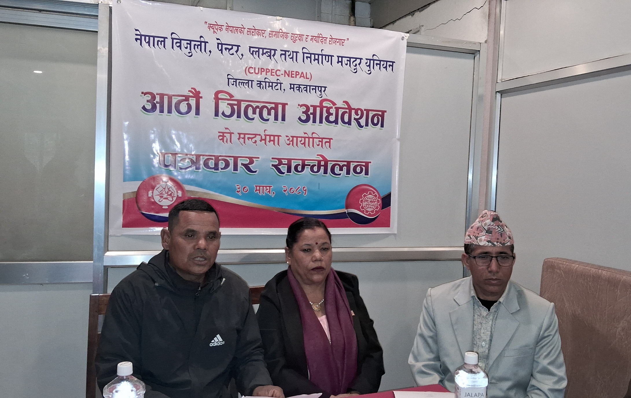 हेटौंडा । नेपाल विजुली, पेन्टर, प्लम्बर तथा निर्माण मजदुर युनियन (क्युपेक) नेपाल मकवानपुर शाखाको आठौं जिल्ला अधिवेशन फागुन २ र ३ गते हुने भएको छ । बुधबार हेटौंडामा पत्रकार सम्मेलन गर्दै मकवानपुर क्युपेकका अध्यक्ष प्रल्हाद राईले अधिवेशनबारे जानकारी गराएको हो । नेपाल ट्रेड युनियन महासंघ (जिफन्ट) को शसक्त घटक...