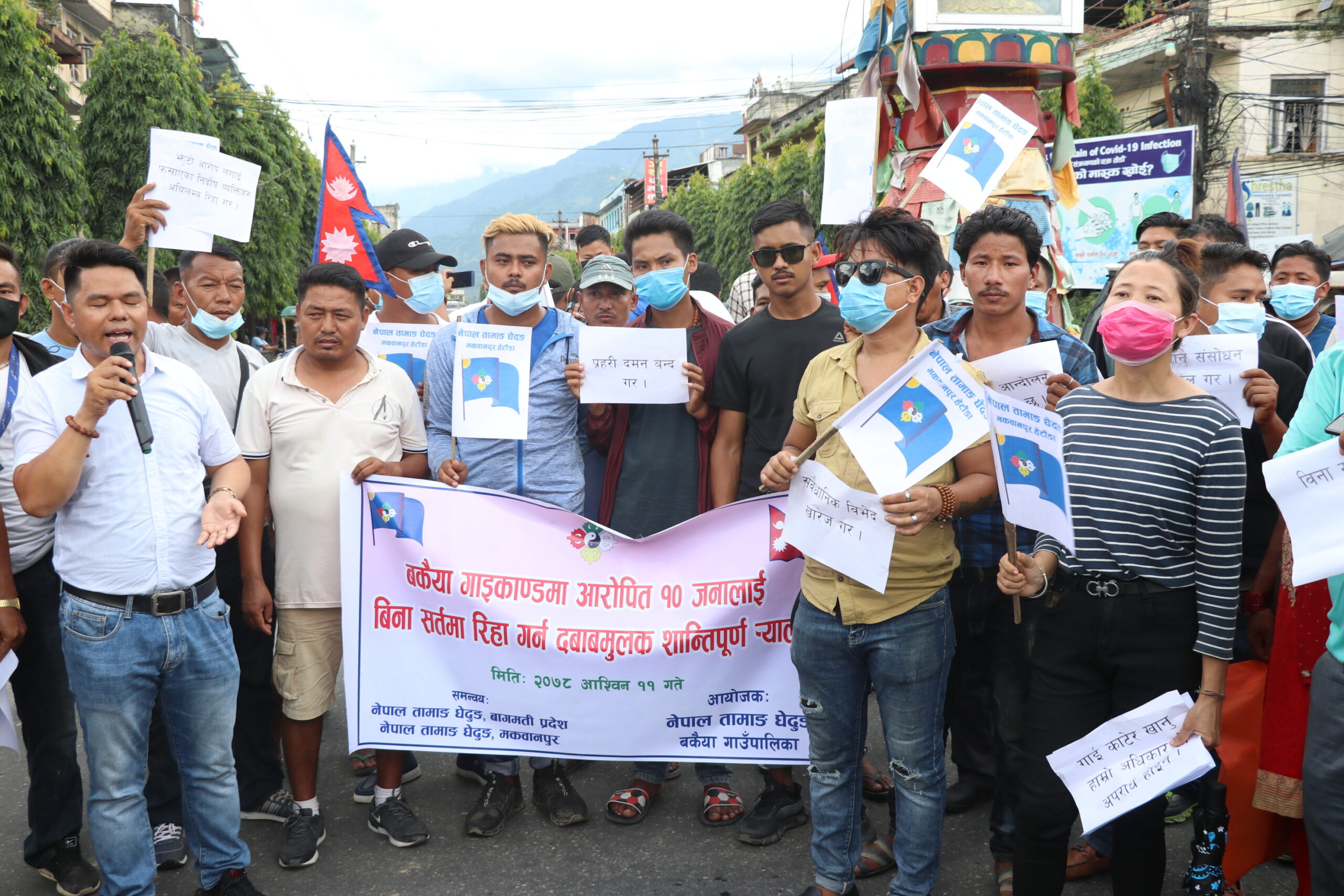 मकवानपुर । गाई काटेको आरोपमा पूर्वी मकवानपुरको बकैया गाउँपालिकाबाट गत अषाढमा पक्राउ परेकाहरुलाई बिना शर्त रिहाईको माग गर्दै आज हेटौंडामा शान्तिपूर्ण प्रर्दशन गरिएको छ । नेपाल तामाङ घेदुङ बकैया गाउँपालिकाको आयोजनामा हेटौंडाको बुद्धचोकमा शान्तिपूर्ण प्रर्दशन गरेको थियो । प्रर्दशनमा सहभागिहरुले ‘प्रहरी दमन बन्द गर,झुट्टा आरोप खारेज गर,संवैधानीक विभेदखारेज गर,गाई...