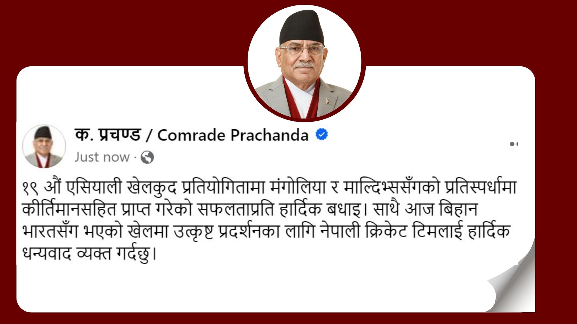 काठमाडौं । प्रधानमन्त्री पुष्पकमल दाहाल प्रचण्डले १९ औं एसियाली खेलकुदमा सहभागी नेपाली क्रिकेट नेपाली टोलीलाई बधाई दिएका छन् । मंगलबार सामाजिक सञ्जालमार्फत प्रधानमन्त्री प्रचण्डले मंगोलिया र माल्दिभ्ससँगको प्रतिस्पर्धामा नेपालले कीर्तिमानसहित प्राप्त गरेको सफलताप्रति र भारतसंग गरेको उत्कृष्ट प्रर्दशनप्रति खुसी व्यक्त गर्दै बधाई दिएका हुन् । उनले लेखेका छन्,‘१९ औं...