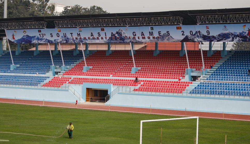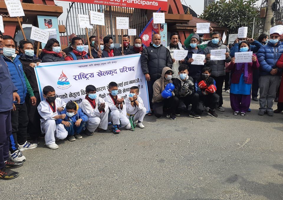 सदस्य सचिवको टुंगो नलाग्दा खेलकुद क्षेत्र ठप्प, दशरथ रंगशाला बाहिर कालोपट्टी बाँधेर खेलाडीको प्रदर्शन