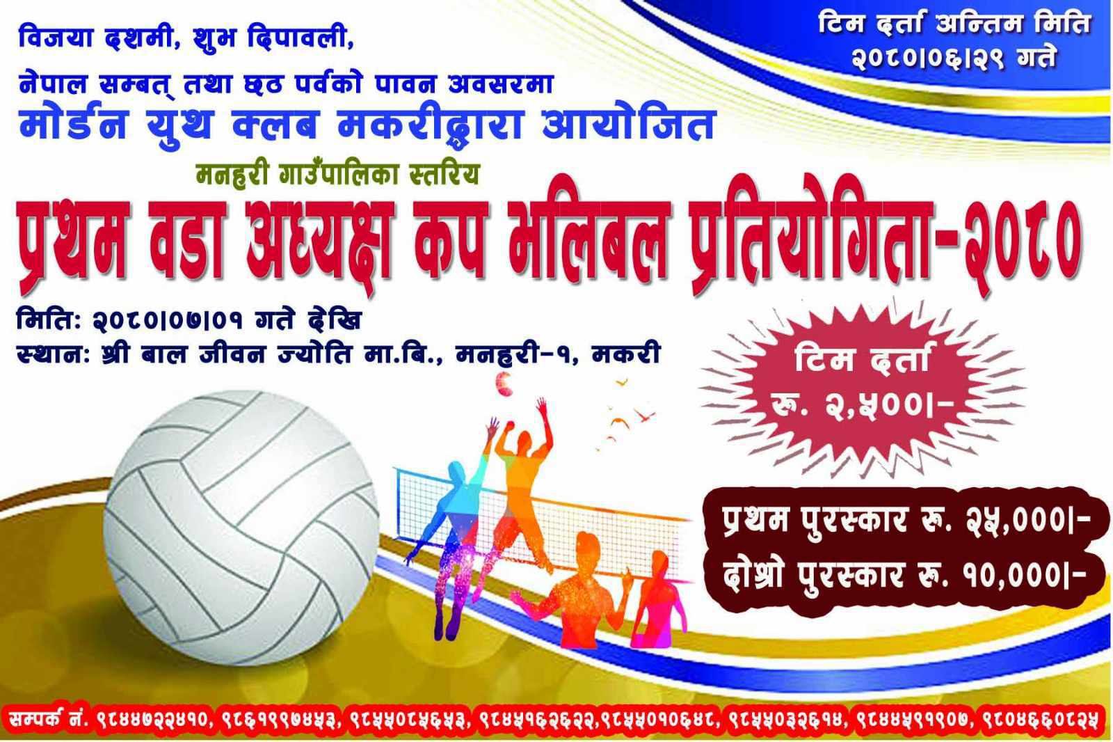 मकवानपुर । मकवानपुरको मनहरी गाउँपालिकामा भोलीबाट प्रथम वडा अध्यक्ष कप भलिबल प्रतियोगिता हुने भएको छ । नेपालीहरुको महान चाड विजया दशमीको अवसर पारेर मोर्डन यूथ क्लब मकरीले मनहरी गाउँपालिका स्तरीय नकआउट भलिबल प्रतियोगिताको आयोजना गर्न लागेको हो । प्रतियोगितामा बिजय हासिल गर्ने समुहले २५ हजार नगदसहित ट्रफी र मेडल...